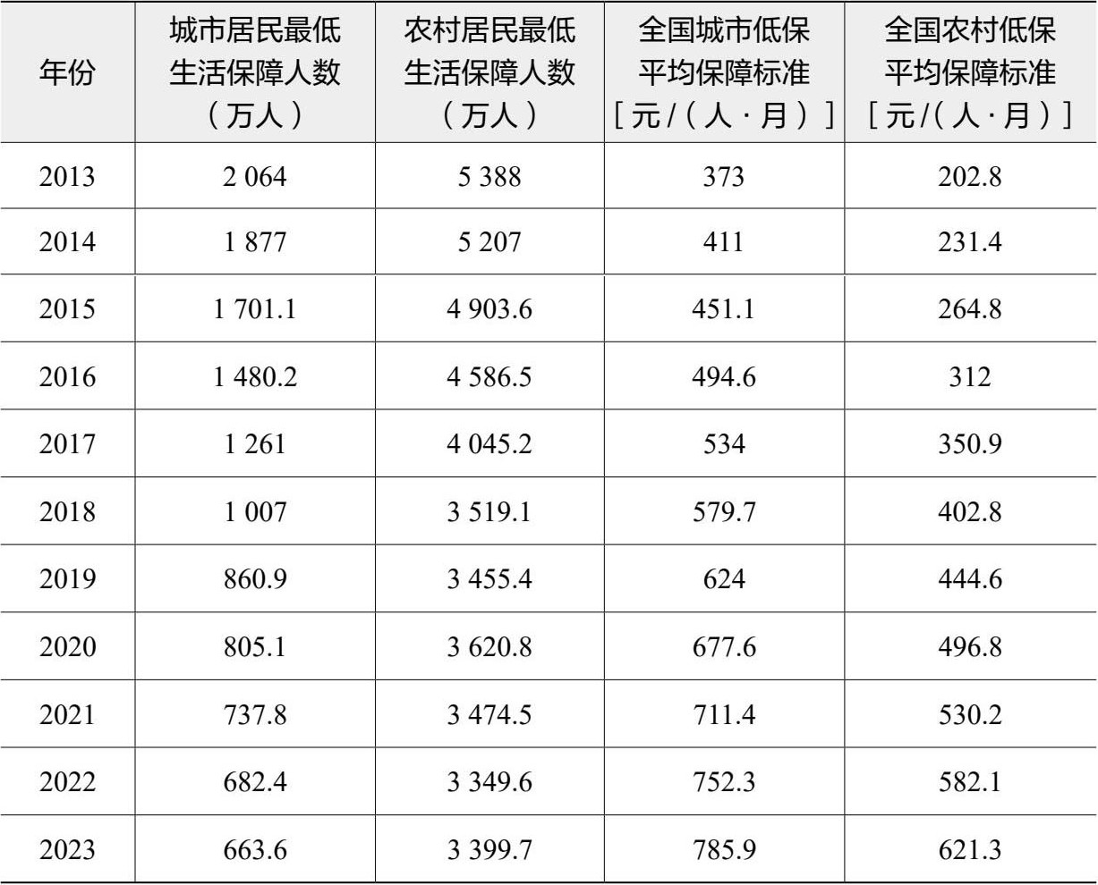 表1.7 2013—2023年全国城市、农村低保人数和标准