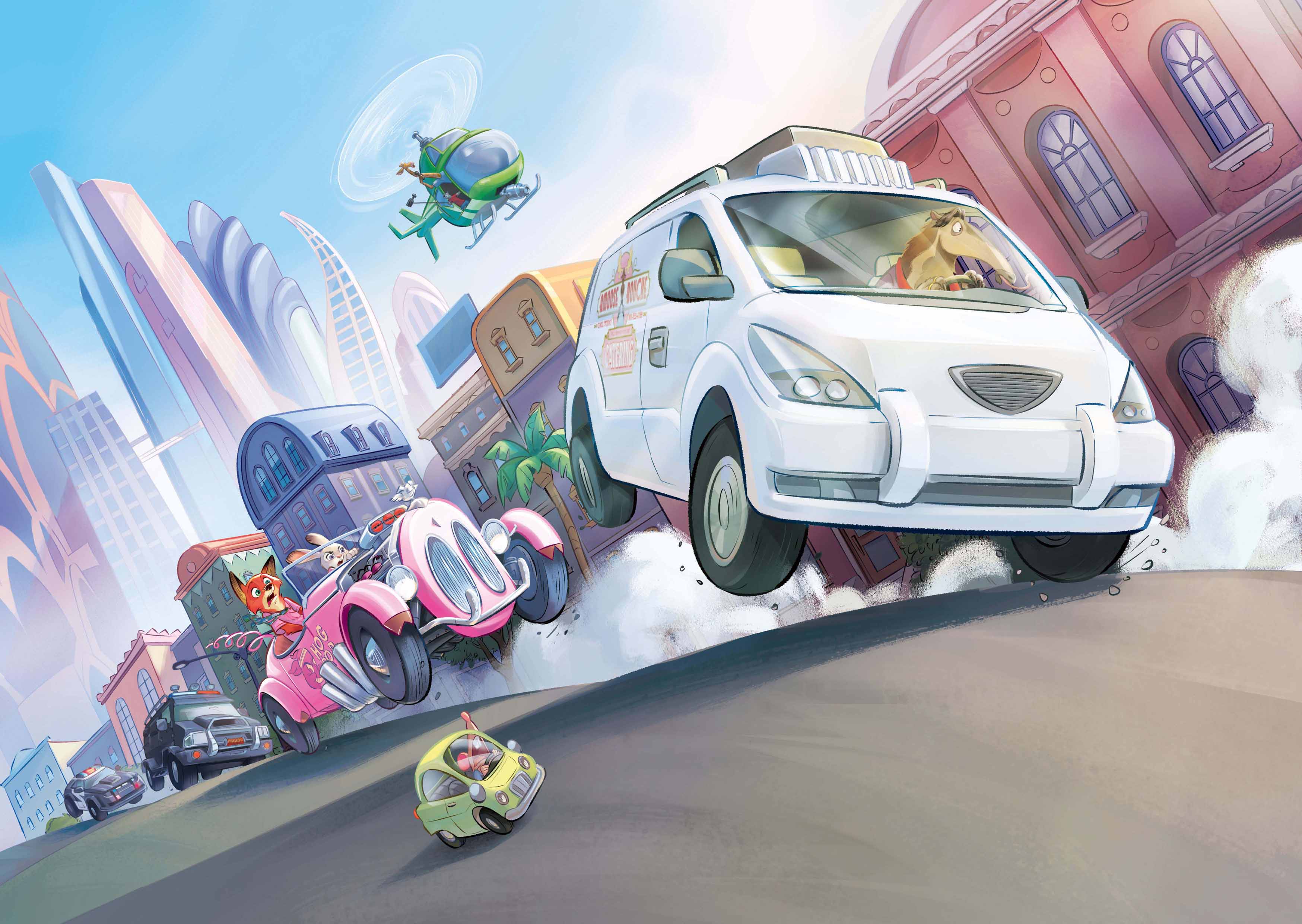 当市民们低头默哀时,餐车撞上了雕像!食蚁特检察员从车里飞了出来,正好落进附近的一辆警车里。车里的两名斑马警官不敢相信自己的好运气。他们对视一眼,齐声喊道:“斑马搭档!”