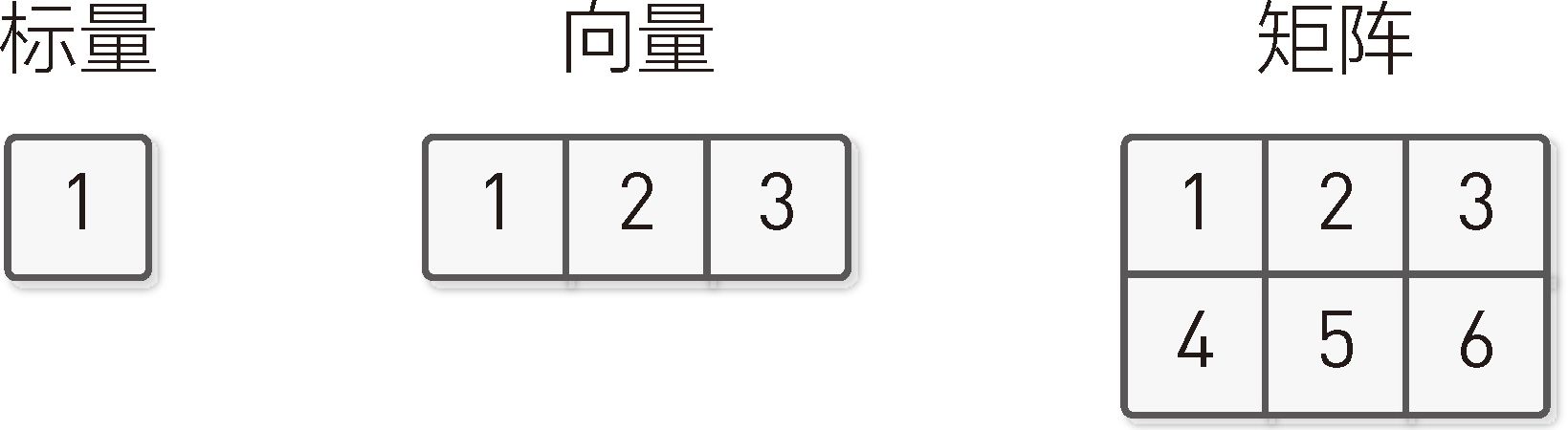 图1-2 中从左到右依次为零维矩阵、一维矩阵、二维矩阵,它们分别叫作标量、向量和矩阵。标量就是简单的一个数。数沿着一个轴排列的是向量,数沿着两个轴排列的是矩阵。