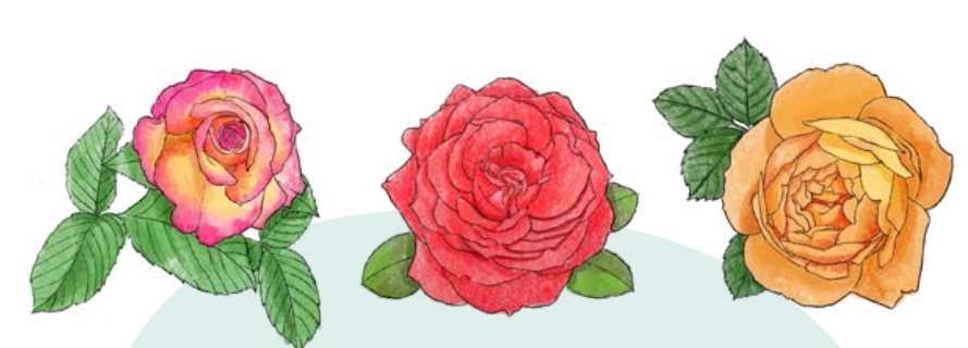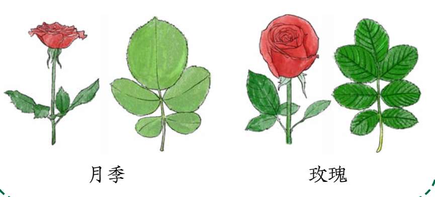 月季:花朵较大,花瓣通常较为松散,花形丰富多样。叶子为奇数羽状复叶、小叶一般为3 ~ 5 片,前端比较尖,边缘的锯齿相对较浅,两面无毛,叶面有光泽。