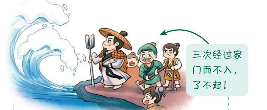 2.大禹为了治理洪水,吸取父亲鲧治水失败的教训,改堵为疏。在外治水13年,三过家门而不入,他率领民众不畏艰险、开山辟石、疏通河道,最终获得成功。