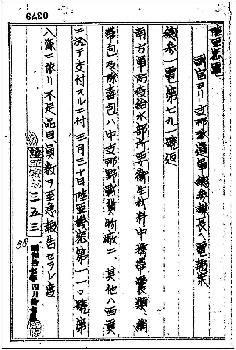 图1-1 昭和十七年四月十七日密电之第2页。日本陆军省副官指示支那派遣军总参谋长,提供卫生材料给组建中的南方军防疫给水部。左起第三行写着所援引的上级军令为“三月三十日陆亚机密第一一〇号”,编号第0379页