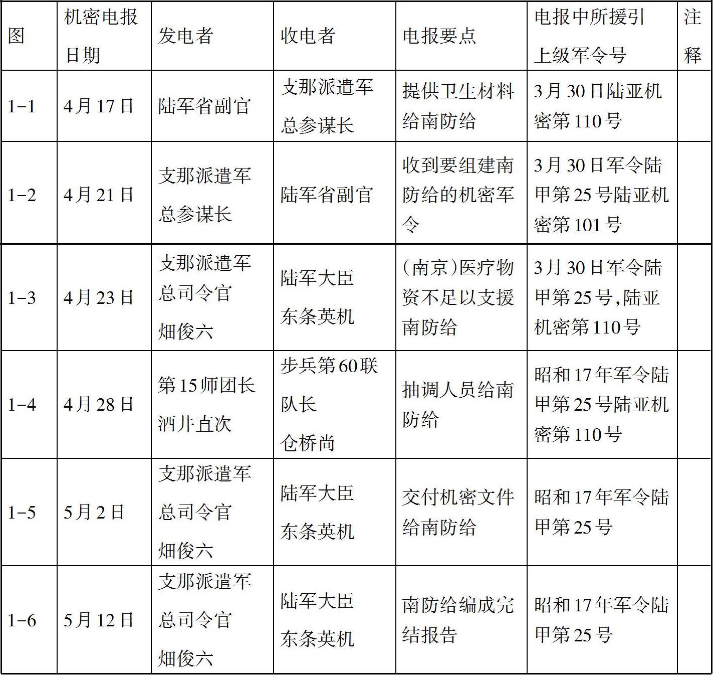表1-1 编组南方军防疫给水部期间(1942年4—5月),日本陆军省(东京)和支那派遣军(南京)之间六封援引“军令陆甲第二五号”的机密电报