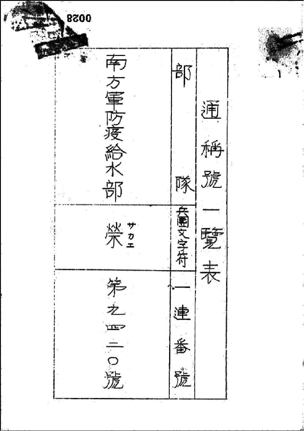 在目前公开的这份文献中,并没有以上列于第二的《南方军防疫给水部将校职员表》,不知这一页到底是在战时遗失,还是战后未曾提交给驻日美军。三个连续4位数号码(0026、0027、0028)的印章,说明这一页在文献管理者盖页码印章时就不在该文件中。希望在不久的将来能够找到这失去的一页,了解当时部队重要成员将校职员的组成。