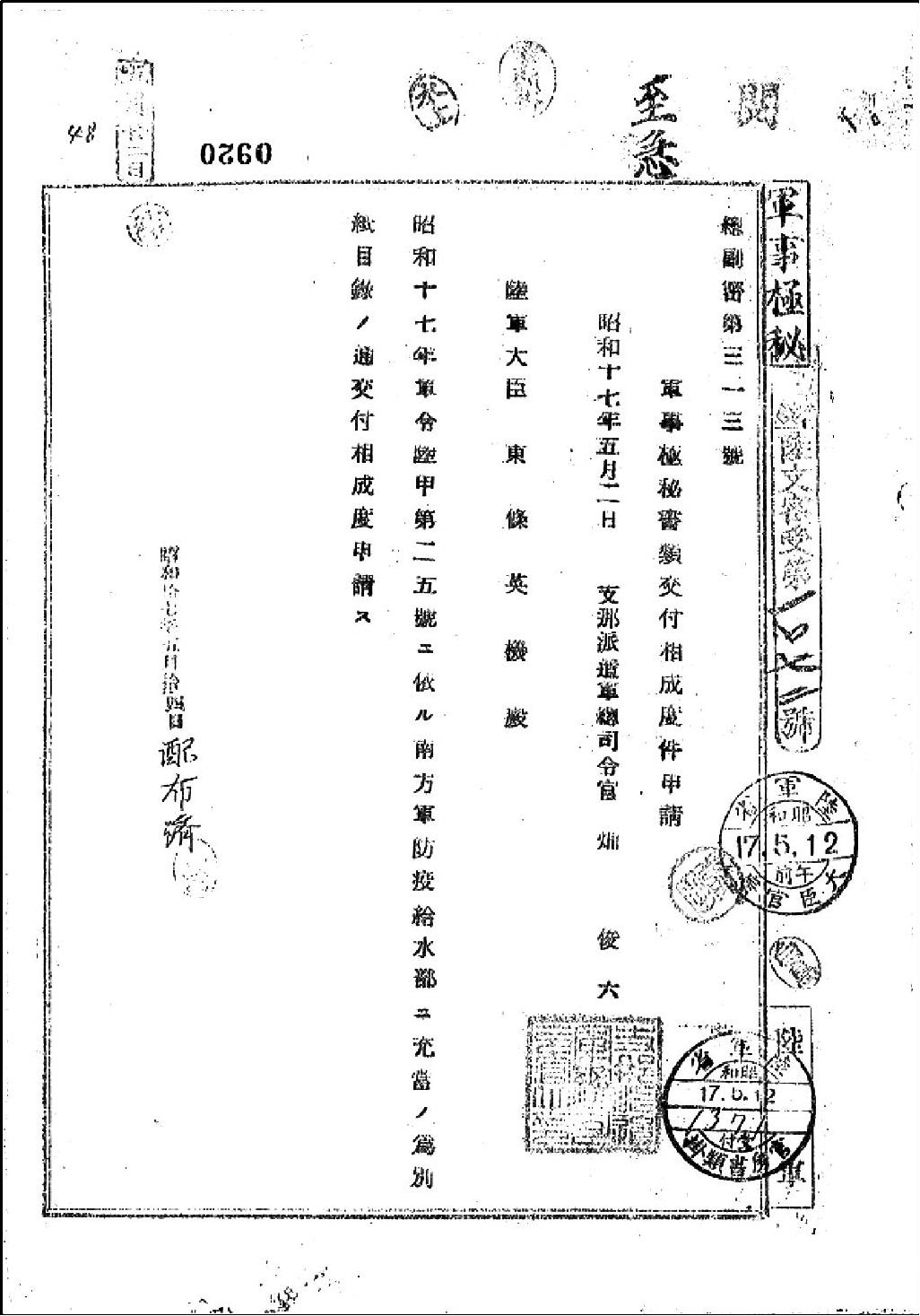 图1-5 昭和十七年五月二日密电。支那派遣军总司令官畑俊六上报陆军大臣东条英机:已将一组机密文件转发组建中的南方军防疫给水部予以申请用。援引的上级军令是“昭和十七年军令陆甲第二五号”,编号第0920页