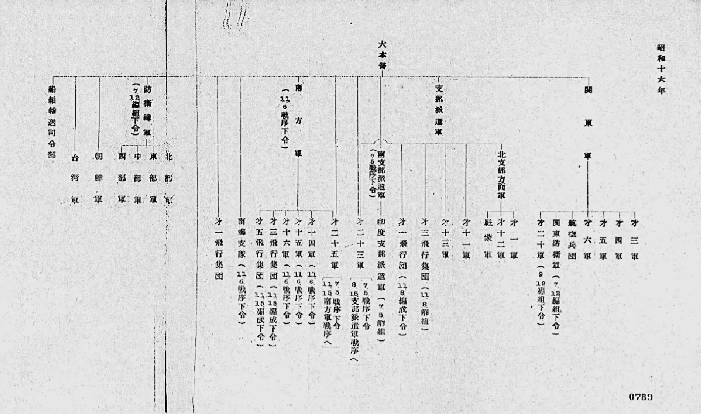 南方军位于图中央偏左。从右到左排列着日军大本营指挥下的五大军:关东军、支那派遣军、南方军、防卫总军和船舶输送司令部。