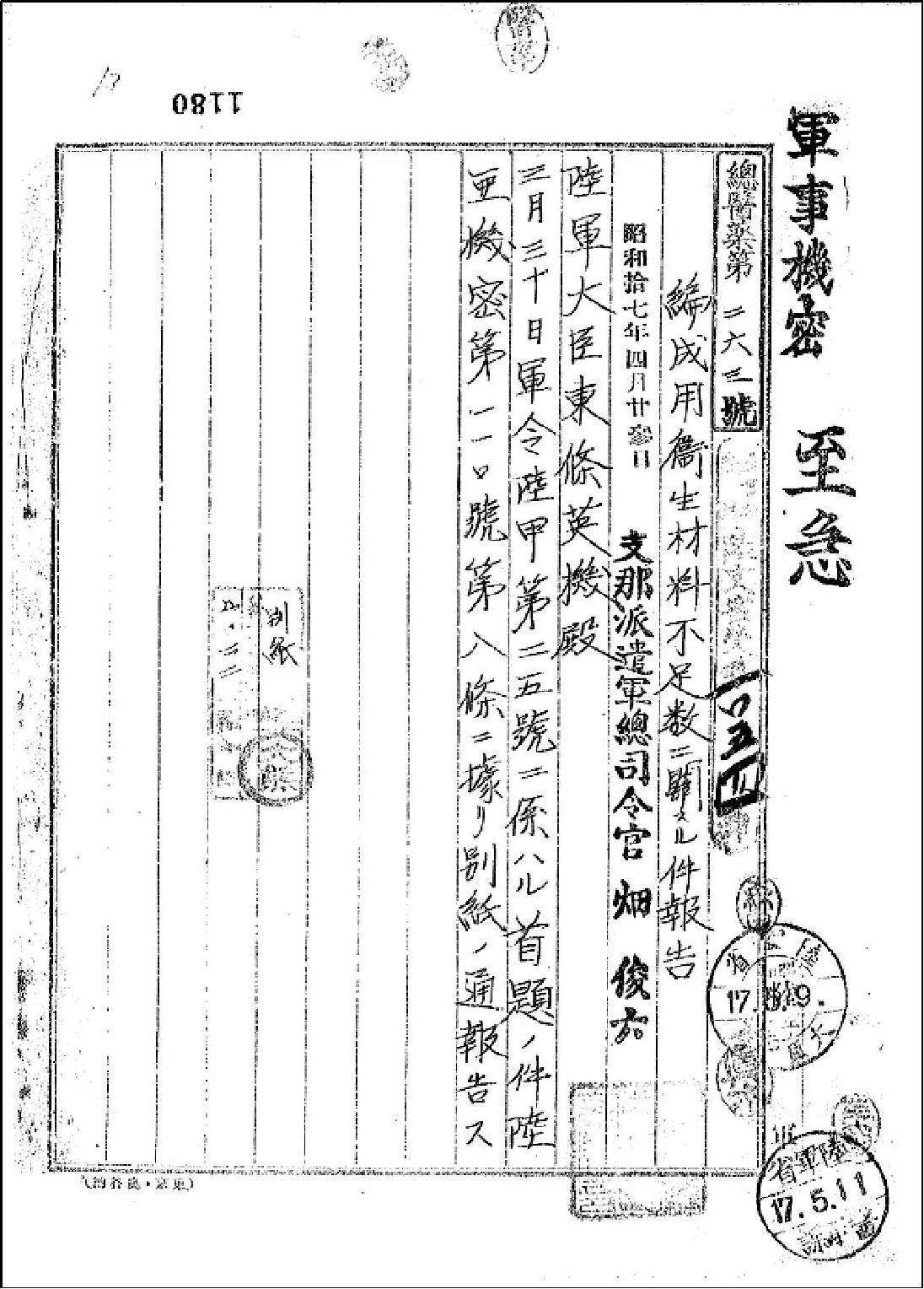 图1-3 昭和十七年四月二十三日密电。支那派遣军总司令官畑俊六上报陆军大臣东条英机,(南京)医疗物资不足以支援临时编队的南方军防疫给水部。援引上级军令“三月三十日军令陆甲第二五号陆亚机密第一一〇号”,编号第1180页