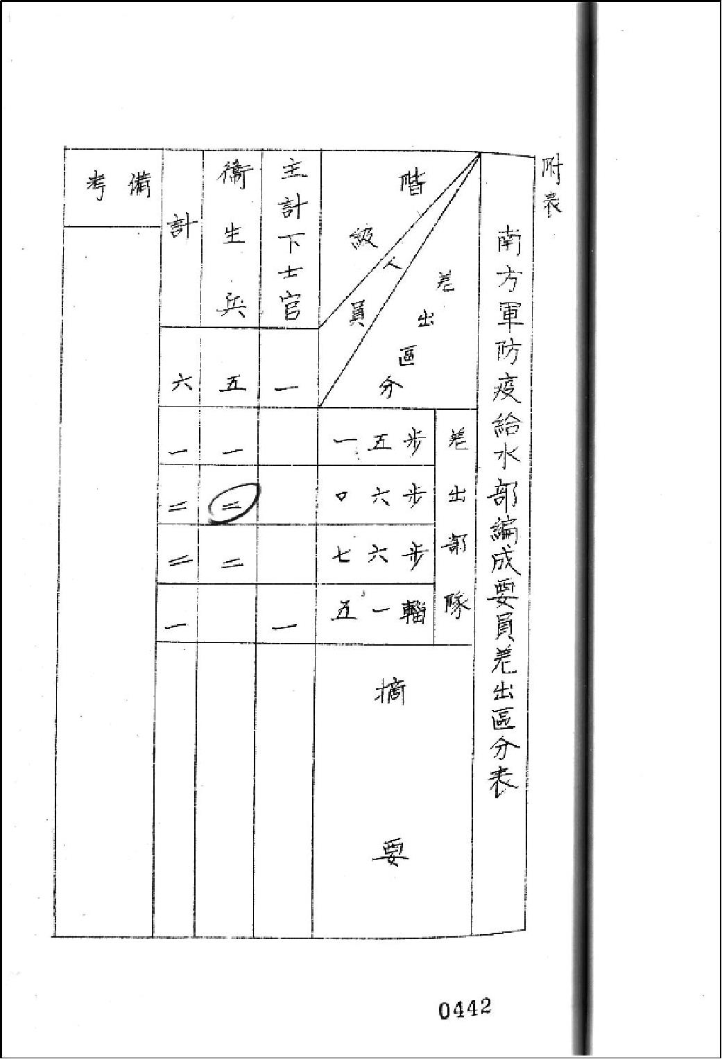图1-11 酒井直次军令的附表「南方軍防疫給水部編成要員差出区分表」,编号第0442页