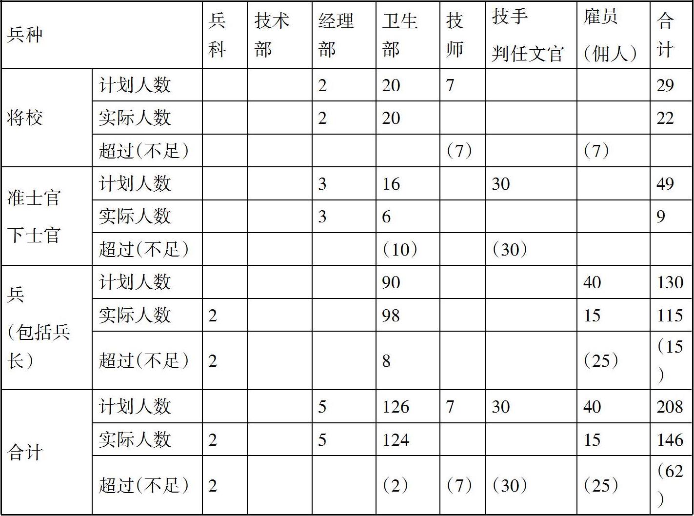 表1-3中排列在第一行的将校人员编制计划人数中,一共要有20名卫生将校和7名将校级技师。这27人应该是南方军防疫给水部这支细菌部队的核心干部。