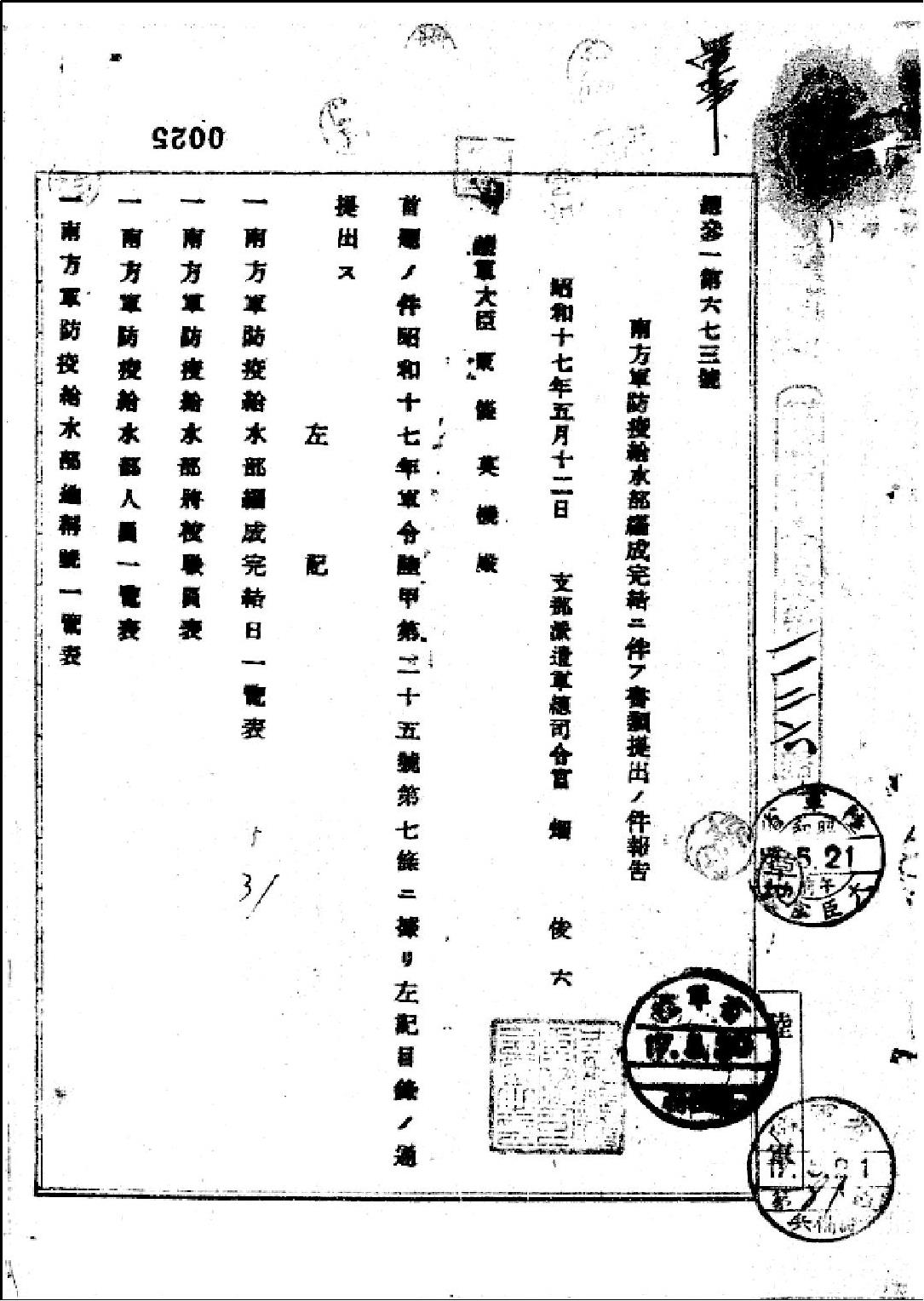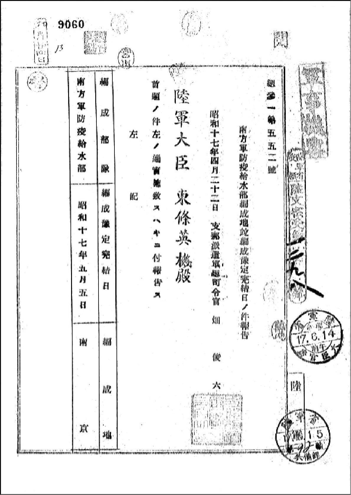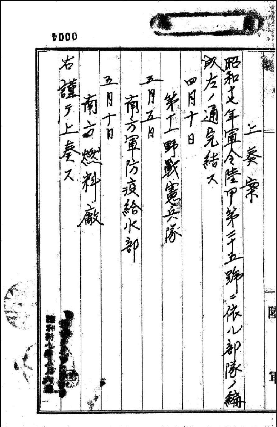 南方燃料厂是日本“大东亚共荣圈”的重要战略资源。因此排列在三份报告之首。第二份是东部军(日本本土东部)司令中村孝太郎报告第十一野战宪兵队的编队完成,第三份是由畑俊六提呈南方军防疫给水部的编队完成报告。