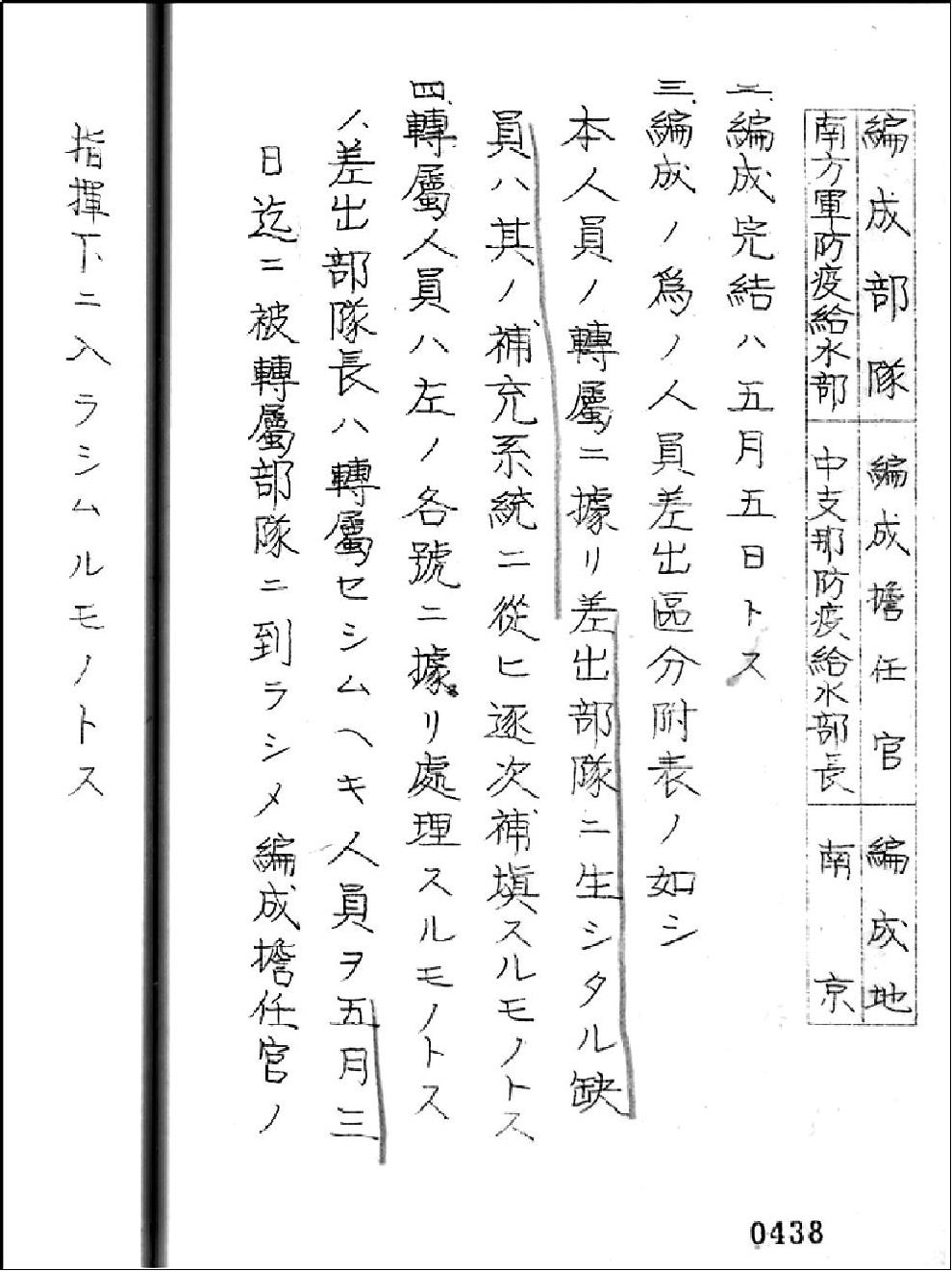 图1-9 酒井直次军令的第2页(编号第0438页)有两个重点:第一点,编成担任官为中支那防疫给水部长;第二点,指示抽调人员必须最迟在5月3日到达转属部队报到