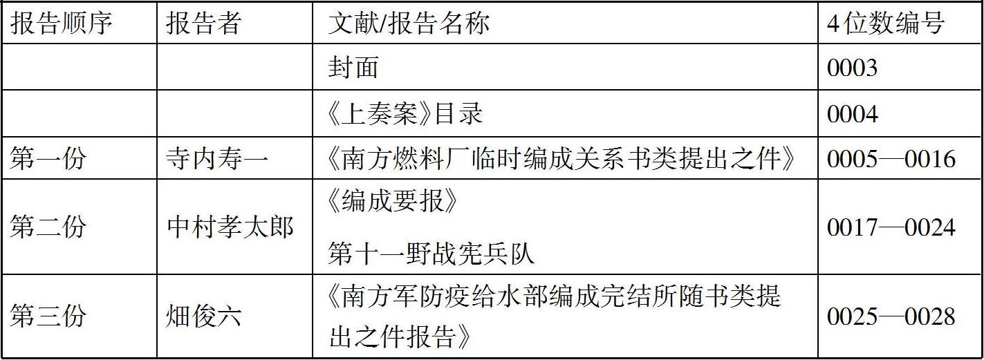等人一起联合提交东条英机的一份报告,称为《编成完结之件》,共有26页。该报告的第2页(编号0004页)右侧写着“上奏案”三个字(见图1-12),这是日本军事文献中上奏昭和天皇的军事行动方案的标注。文件由三份报告组成(见表1-2),首先是南方军总司令官寺内寿一呈报南方燃料厂的临时编队完成。这个日方所谓的“南方燃料厂”