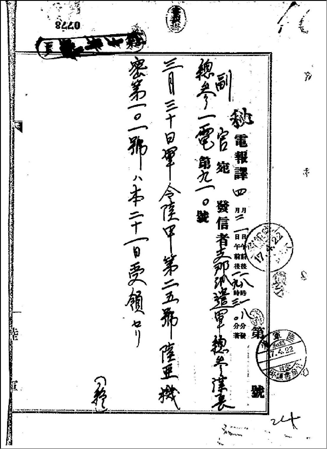 这是一份只有单页的电报,编号第0906页,右上角盖有“军事机密”的印章,其左下方紧接着盖有“陆军省受领/陆支密受第一二九八号”字样,当中的“陆支密”三个字是“陆军支那派遣军秘密文件”之意。“陆亚密”是“陆军亚细亚军秘密文件”之意。“总参一第五五二号”是发电报部门(即支那派遣军总司令)的管理编号。