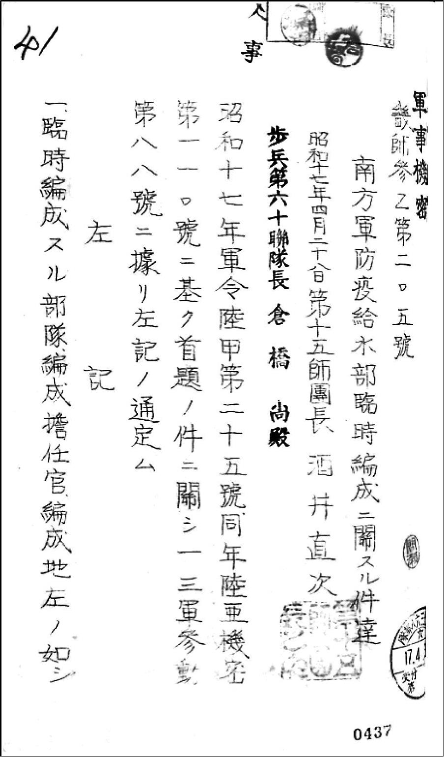 图1-4 昭和十七年四月二十八日密电。支那派遣军第十五师团长酒井直次对所辖步兵第六十联队长仓桥尚发出的《南方军防疫给水部临时编成关系之件》,吩咐仓桥抽出兵员给临时编组的南防给。中央部分援引上级军令“昭和十七年军令陆甲第二十五号同年陆亚机密第一一〇号”,此命令编号0437页以后内容,参见图1-9图1-11