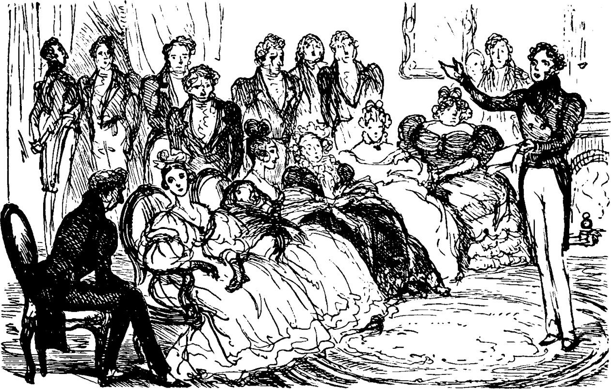 客人到齐了,特·巴日东先生受着妻子嘱咐,仿佛教堂的门丁拿棍子撞击地下的石板一样,不知通知了多少回才叫打扰的人静下来。吕西安坐在一张圆桌前面,靠近特·巴日东太太,心里非常震动。他声音慌慌张张地宣告,为了免得大家失望,他预备念一些新近发现的杰作,是个无名的大诗人写的。虽则安特莱·特·希尼埃的诗集在一八一九年上就印出了,昂古莱姆还没有一个人听见过作者的名字。个个人以为那声明是特·巴日东太太出的计策,既顾着吕西安的面子,也让听众的情绪松动一些。吕西安先念了《年轻的病人》,听见一阵轻轻的赞美声;又念了《盲人》,那些俗物就觉得作品太长了。吕西安一边朗诵一边感到剧烈的痛苦。那种痛苦,只有杰出的艺术家,或者凭着热情和高度的悟性和艺术家并肩的人,才能完全体会。你要不真诚严肃、全神贯注,休想用声音来表达诗,也休想领会诗。朗诵的人和听众必须密切结合,否则感情不可能像电流一般沟通。双方的心灵不打成一片,诗人就等于一个天使在地狱的诟谇声中唱天国的颂歌。而凡是聪明人,在他的器官特别发展的领域之内,都具有蜗牛般眼观四方的目力,狗一般的嗅觉,田鼠般的耳朵,能看到、感到、听到周围的一切。有人赏识还是无人了解,音乐家和诗人立刻能感觉到,同植物在适宜的气候中复苏,在不适宜的气候中枯萎一样快。当时那班男人只是为奉陪太太而来,来了又忙于谈彼此的私事,唧唧哝哝的声音,由于特殊的音响作用,传到吕西安耳边格外响亮;他还看见有些人张着大嘴打呵欠,对他恶狠狠地露着牙齿。等到他像洪水中的鸽子 ,想找一个愉快的地方让眼睛停留一下,又发现一些不耐烦的眼神,表示他们只想利用当天的集会和朋友们商量实际问题。除了洛尔·特·拉斯蒂涅、两三个年轻人和主教以外,在场的人没有一个不闷得发慌。真正懂诗的人会把作者诗句中只透露一星半点的东西拿到自己心中去发展。而这班冷冰冰的听众非但对诗人的情绪毫无感受,连他的声调口吻都没听进去。吕西安灰心到极点,一身冷汗把衬衫湿透了。他转身望望路易士,看见她眼神热烈,才鼓足勇气把诗念完;可是诗人的心已经大受伤害。