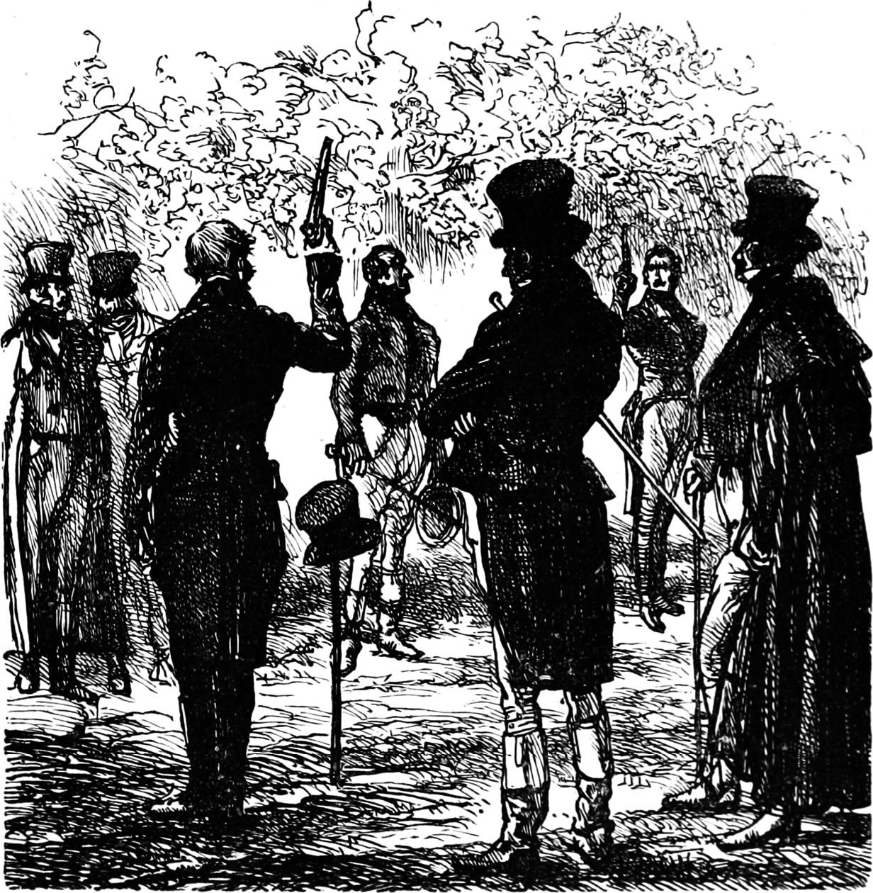法朗西斯对夏德莱说:“没关系!你把两人隔开二十步,用骑兵手枪,包你不会打中。”