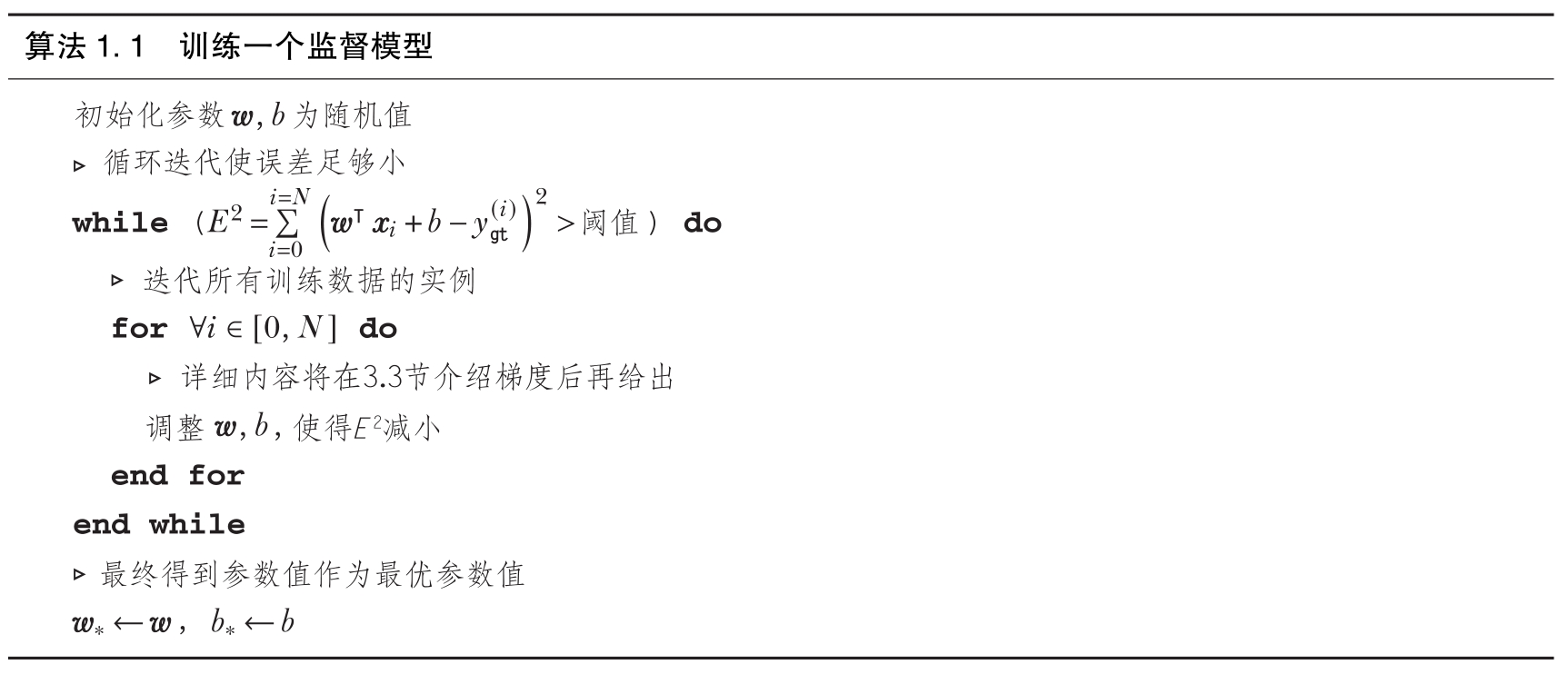 在大多数情况下,我们无法使用闭型解来得出最优的 w , b 。因此,我们采用了迭代的方法,如算法1.1所示。