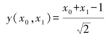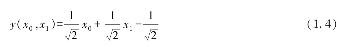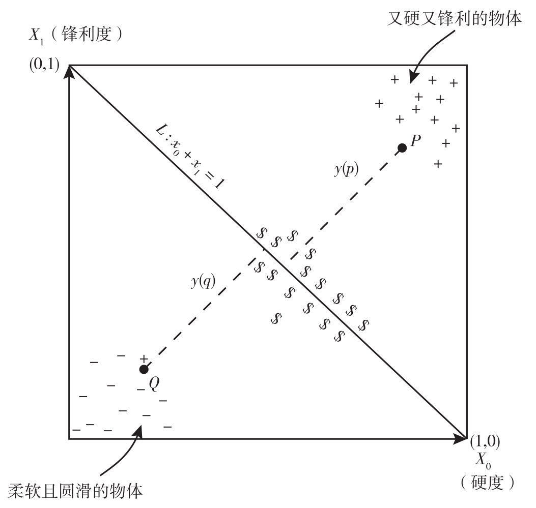 让我们继续以猫脑模型为例来阐述这一概念。如前所述,我们的特征空间是二维的,包含两个坐标轴,其中, X 0 表示硬度, X 1 表示锋利度 [1] 。这个二维空间中的每个点都由坐标值( x 0 , x 1 )表示,如图1.2所示。因此,衡量威胁评分的一种有效方法是计算单个点到直线 x 0 + x 1 =1的距离。