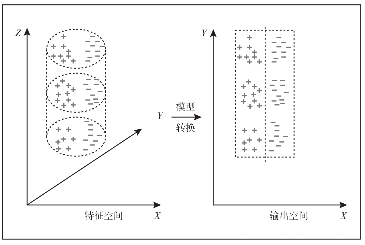 图1.3 模型将输入(特征)空间中的点映射到一个输出空间,在该空间中,可以更容易地区分不同的类别。例如,在该图中,属于两个类别的输入特征点用+和-表示,分布在三维特征空间中的一个圆柱体上。该模型将圆柱展开为一个矩形,特征点被映射到一个二维平面的输出空间上,在那里可以用一个简单的线性分类器来区分这两个类别