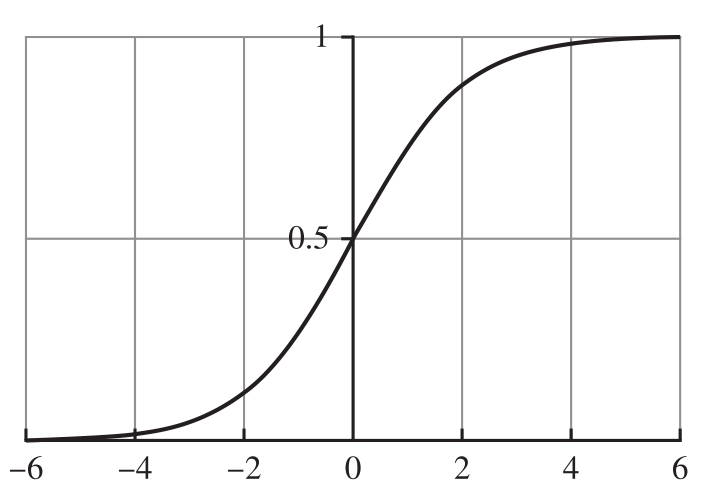 sigmoid函数的图像如图1.5所示。因此,我们可以采用以下流行的模型架构(尽管仍然相对简单)来对它进行建模,该架构将输入加权和的sigmoid函数(不包含额外参数)作为输出: