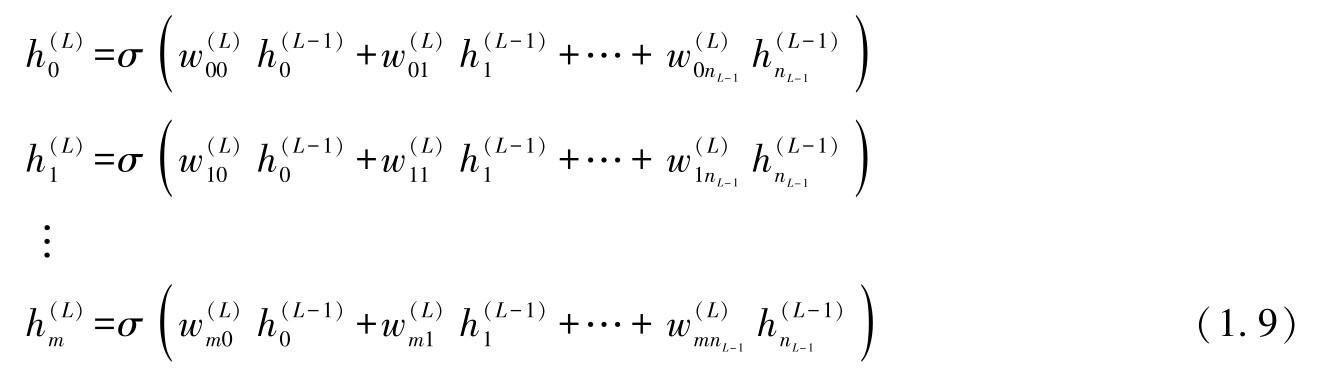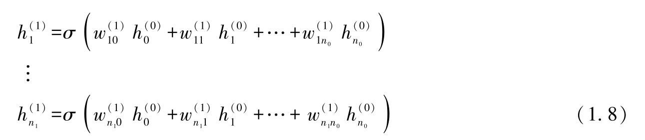 我们用以下方程对该系统进行了描述。请注意,我们在权重上添加了上标,以此来标识不同的层(第0层最接近输入;第 L 层是最后一层,离输入最远)。我们还使用了二维下标(因此给定层的权重就形成了一个矩阵),第一个下标表示目的节点,第二个下标表示源节点(见图1.7)。