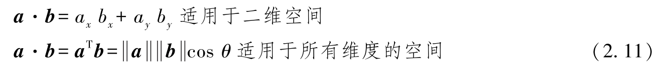 点积可以通过向量之间夹角的余弦来表示。给定两个向量 a 和 b , θ 为它们之间的夹角,则有(见图2.7b)