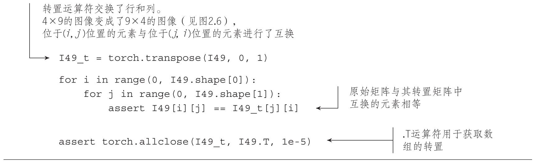 代码清单2.5显示了矩阵转置的PyTorch代码。