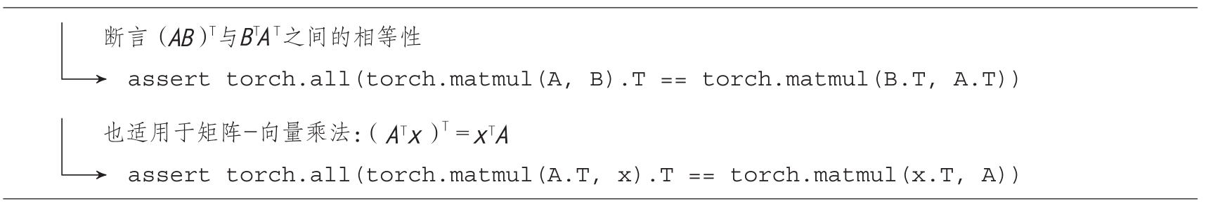 给定两个矩阵 A 和 B ,其中 A 的列数与 B 的行数相匹配,它们乘积的转置等于颠倒顺序后的各自转置的乘积:( AB ) T = B T A T 。代码清单2.9展示了用于矩阵乘积转置的PyTorch代码。
