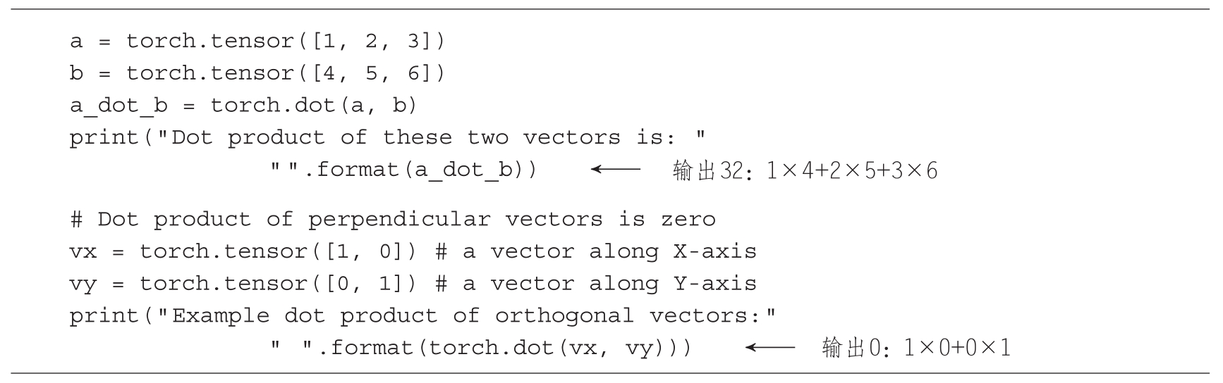 两个向量 a 和 b 的点积表示其中一个向量在另一个向量方向上的投影分量。考虑两个向量 a =[ a 1 a 2 a 3 ]和 b =[ b 1 b 2 b 3 ],那么它们的点积为 a · b = a 1 b 1 + a 2 b 2 + a 3 b 3 。代码清单2.6展示了用于点积运算的PyTorch代码。