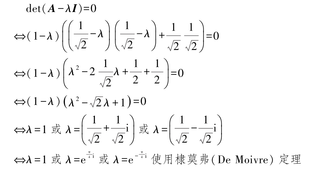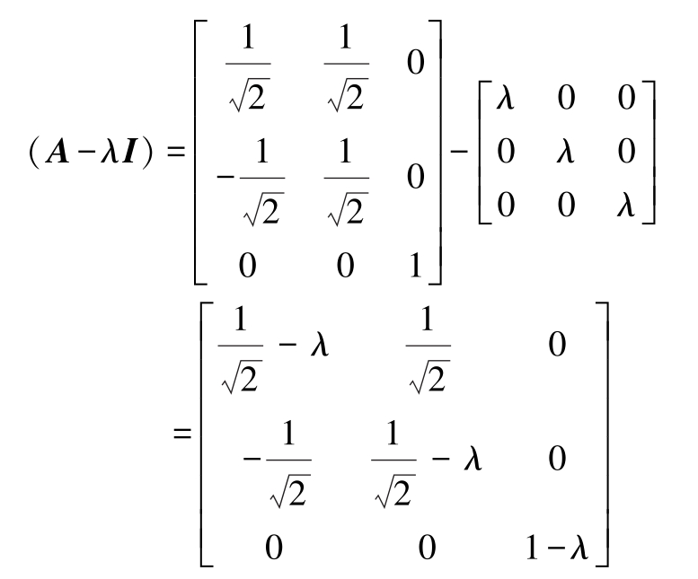 显然,我们只对非平凡解感兴趣,即 e ≠ 0 。在这种情况下, A - λ I 不能是可逆的,否则,我们将得到矛盾的解 e =( A - λ I ) -1 0 = 0 。因此,( A - λ I )不可逆,这意味着其行列式为0,即