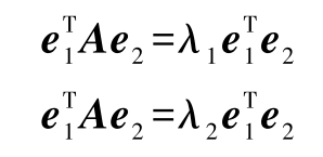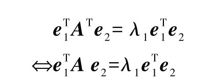 对称矩阵的不同特征值对应的特征向量是互相正交的。让我们通过数学证明来加深对这一概念的理解。如果 A T = A ,则 A 是对称矩阵。如果 λ 1 , e 1 和 λ 2 , e 2 是对称矩阵 A 的特征值-特征向量对,则有