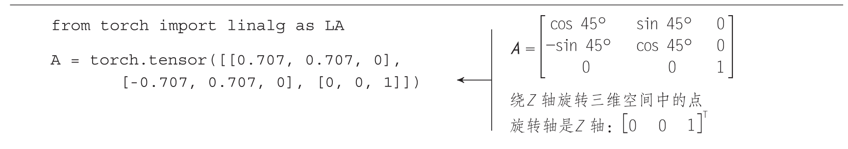对于我们的示例矩阵,其特征向量恰好是 Z 轴。这并非偶然。实际上,矩阵 A 是一个绕 Z 轴的旋转矩阵。因此,旋转矩阵总是有一个特征值为1,其对应的特征向量即为旋转轴。在三维空间中,其他两个特征值将是复数,用于产生旋转角度,该部分内容将在2.14节中进行详细说明。