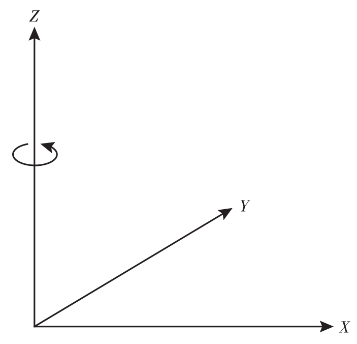 让我们先来非正式地了解一下特征向量。它们具有方阵的属性。如前所述,矩阵可以被视作将一个空间中的向量(点)映射到同一空间或不同空间中的其他向量(点)的线性变换。但是,对于典型的线性变换,空间中会有一些点几乎不受影响。这些点被称为特征向量。它们是变换的重要物理特性。来看一个简单的例子,假设我们正在绕 Z 轴(见图2.13)旋转三维空间中的点。位于 Z 轴上的点即使经过旋转也会保持原位。一般来说,旋转轴上的点(在本例中是 Z 轴)在旋转后不会发生变化。因此,旋转轴是旋转变换的特征向量。