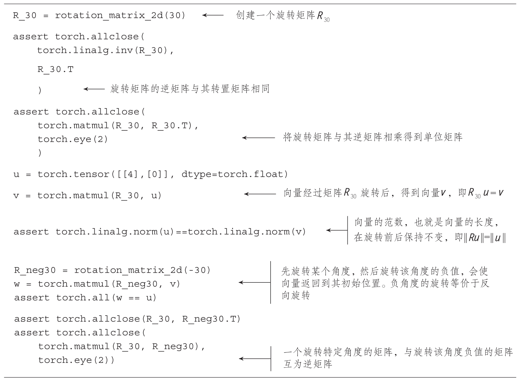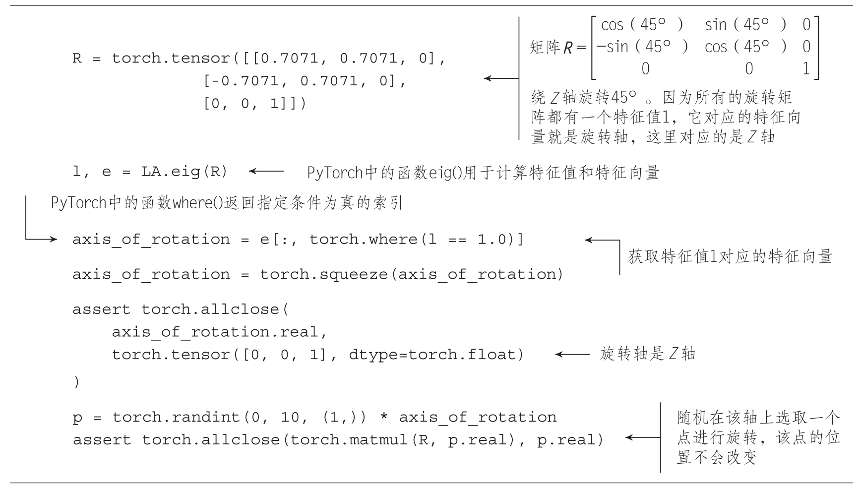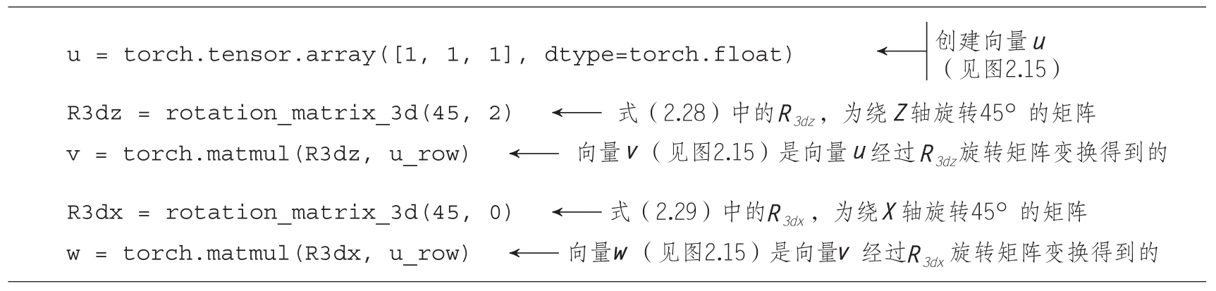 代码清单2.14 展示了用于旋转矩阵的PyTorch代码。
