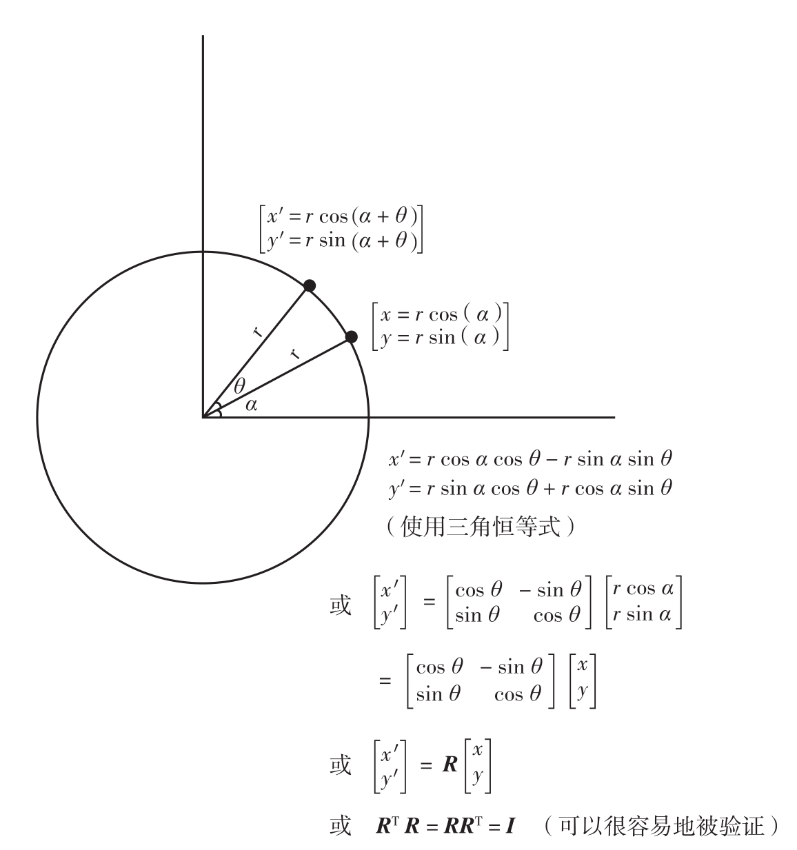 图2.14展示了点( x , y )绕原点旋转了角度 θ 。原始点的位置向量与 X 轴的夹角为 α 。旋转后,该点的新坐标为( x′ , y′ )。注意,根据定义,旋转不会改变点到旋转中心的距离,正如图中的圆圈所示。