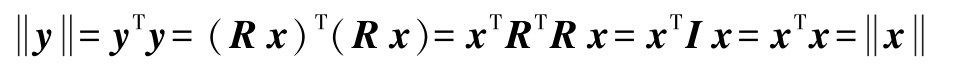 正交性意味着旋转后的向量长度保持不变。给定任意向量 x 和旋转矩阵 R ,设 y = Rx 为旋转后的向量。可以轻易看出,两个向量 x , y 的长度(大小)是相等的,