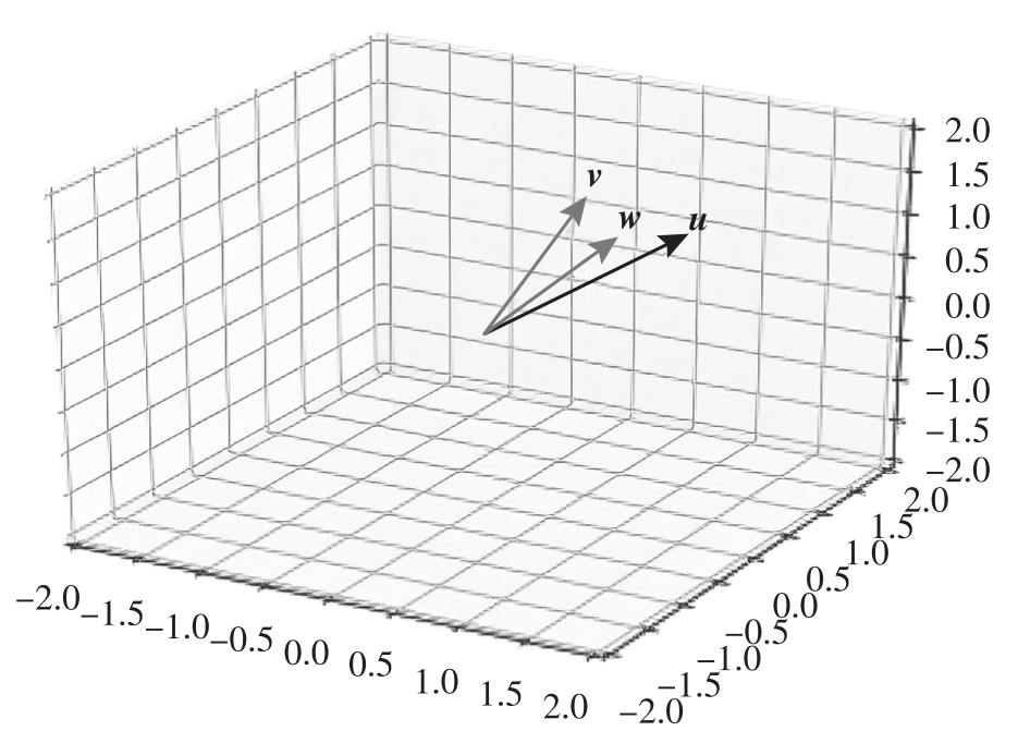 图2.15 旋转可视化的过程。这里,原始向量 u 首先绕 Z 轴旋转45°得到向量 v ,随后再绕 X 轴旋转45°得到向量 w