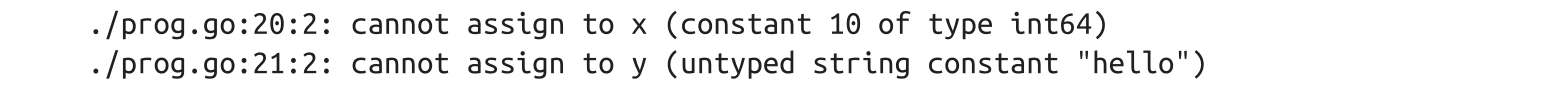 Go语言没有提供一种方法来指定在运行时计算的值为不可变。例如,以下代码将无法编译,并会产生错误:x+y(int 类型的值 )不是常量。
