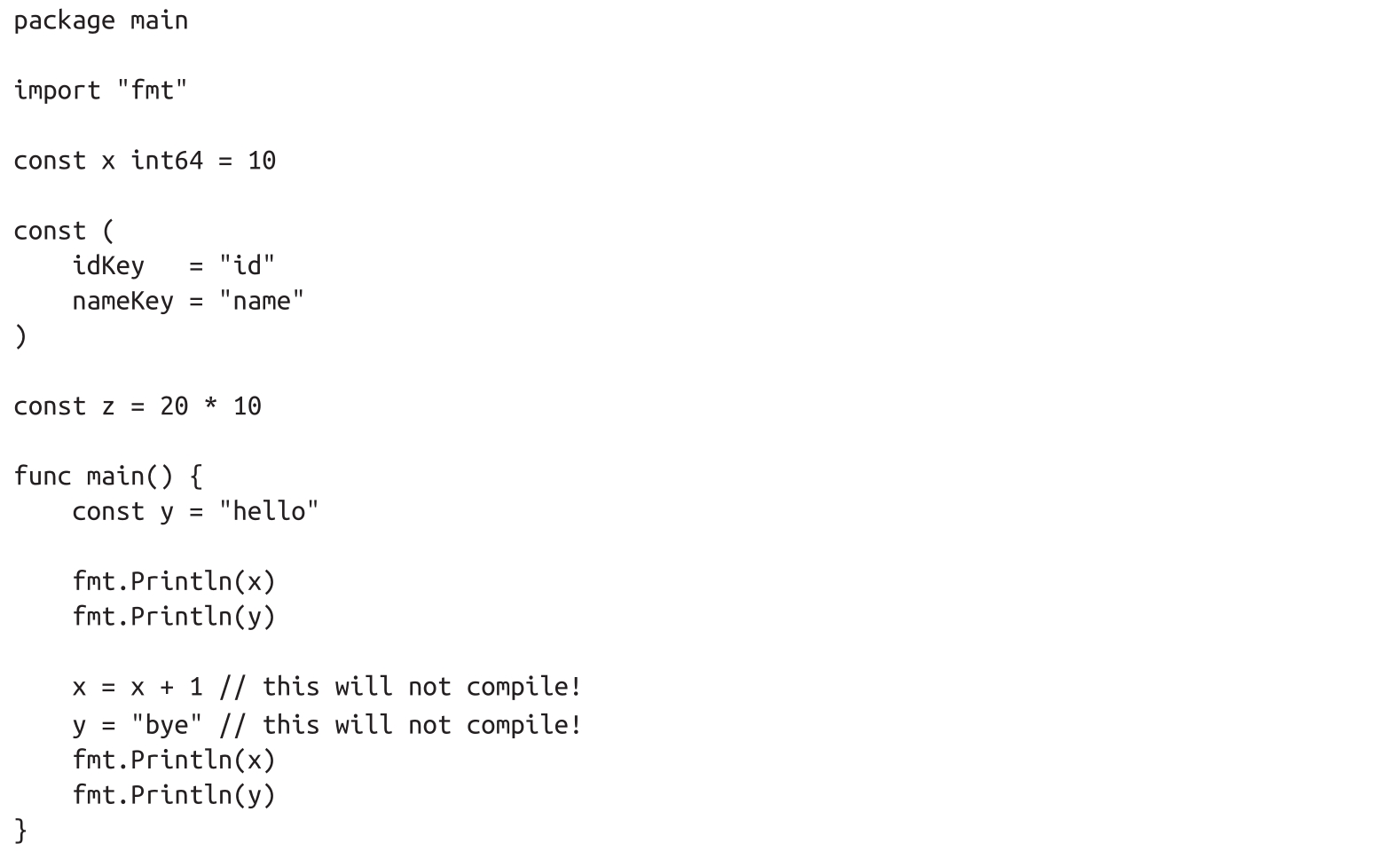 正如你所看到的,你可以在包级别或函数内部声明常量。就像使用var一样,你可以(而且应该)在一对括号内声明一组相关的常量。