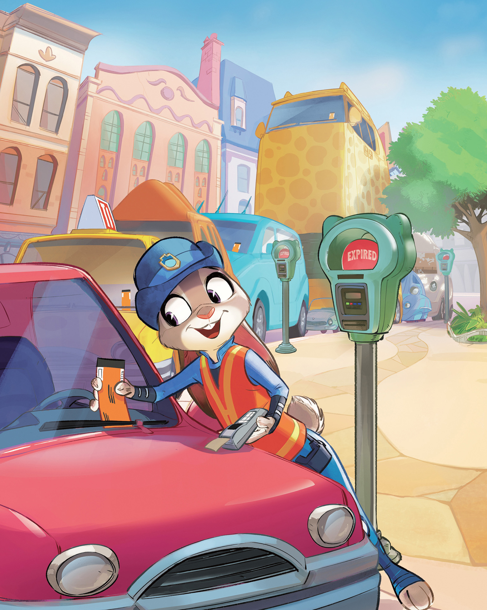 Judy's ears twisted and turned as she used her excellent hearing skills to listen for expired parking meters. Each time one dinged, she dashed over and wrote a ticket. She ticketed dozens of cars of every size—moose cars, mouse cars, and everything in between.