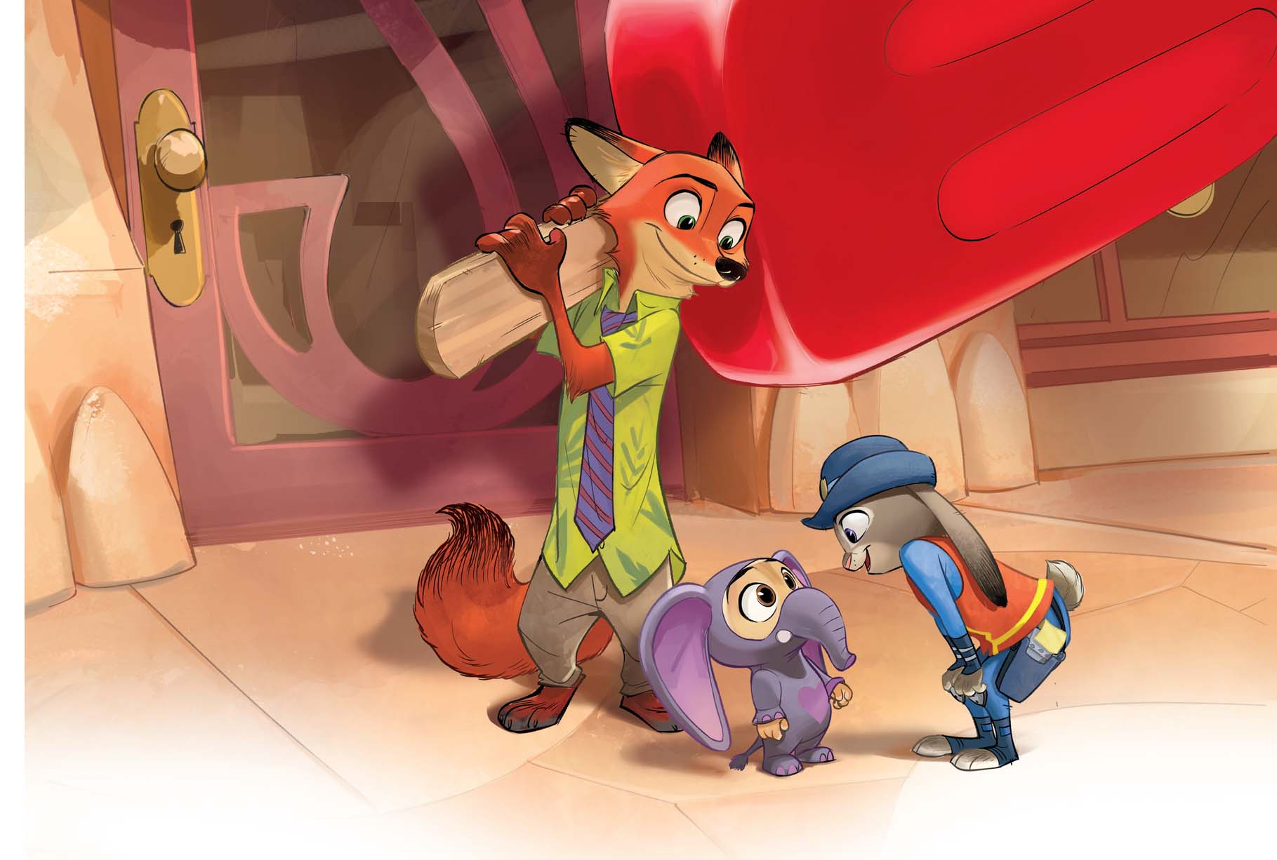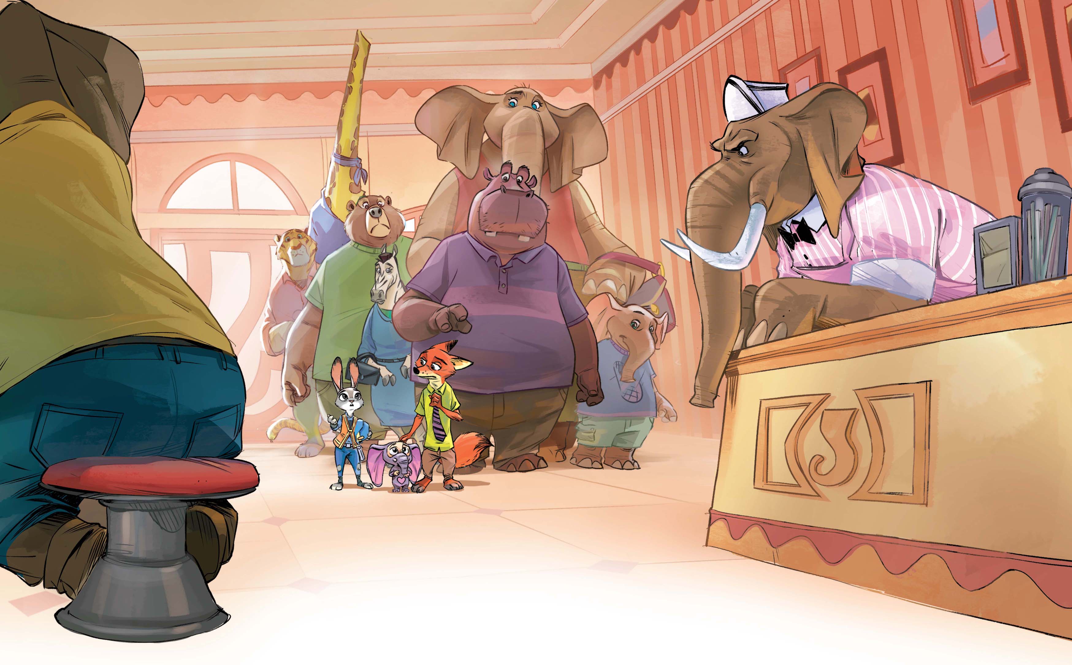 “好吧,我并不想给您添麻烦,不过我认为不戴鼻套就用象鼻舀冰激凌违反了三级卫生标准。这可是件大事。当然,我也可以给您个警告放您一马,只要您给这些象鼻戴上鼻套,然后卖给这位和蔼的父亲和他儿子一根……什么?”朱迪冲着狐狸微微一笑。