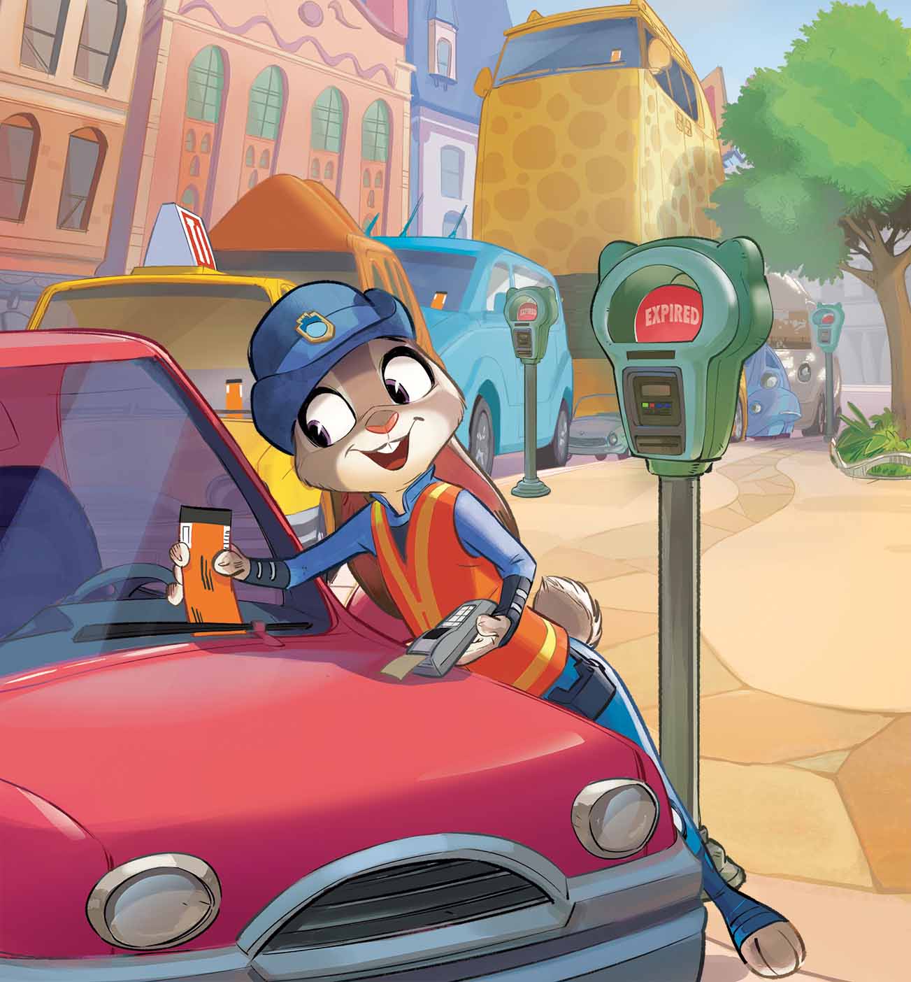 朱迪的耳朵不停地转来转去,她在利用自己敏锐的听觉听停车计时器超时的声音。只要计时器一响,她就冲过去开罚单。她贴了大大小小几十辆汽车——麋鹿车、老鼠车,还有其他不少车子。