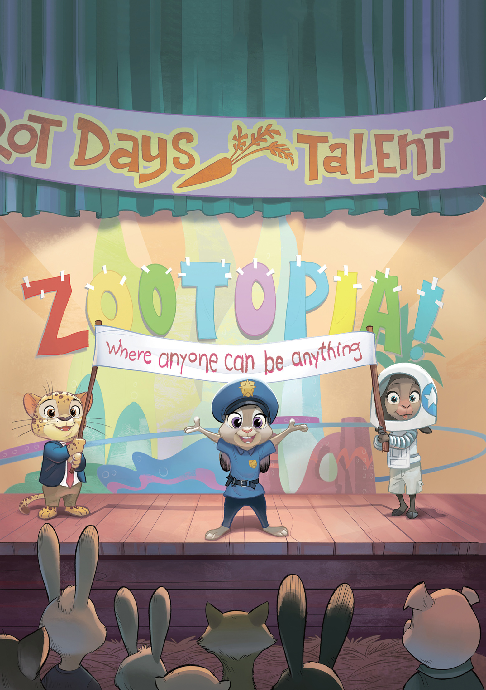 The wild sounds of ancient predators echoed through a large barn in Bunnyburrow. A young bunny named Judy Hopps appeared on a makeshift stage, trying to find her way through a papier-mâché and cardboard jungle.