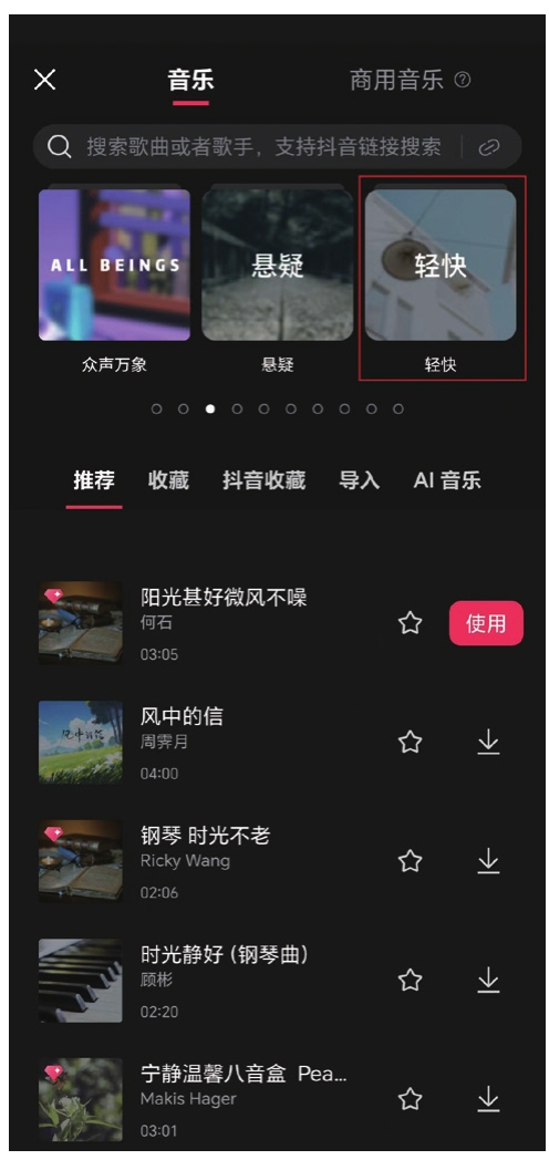 素材截取完成后,可以迅速地拖动白色播放头,浏览整体内容。如果没问题,就可以添加音频了。点击“音频”按钮(见图1.33),然后点击“音乐”按钮(见图1.34),根据素材内容选择“轻快”类型的音乐(见图1.35)。注意在添加音频之前,要使白色播放头位于视频开头。选择好音频并下载后,点击音频右侧的“使用”按钮(见图1.36),就可以将音频添加到轨道上了。