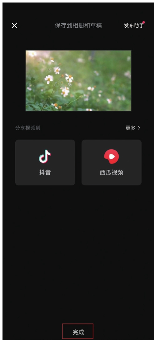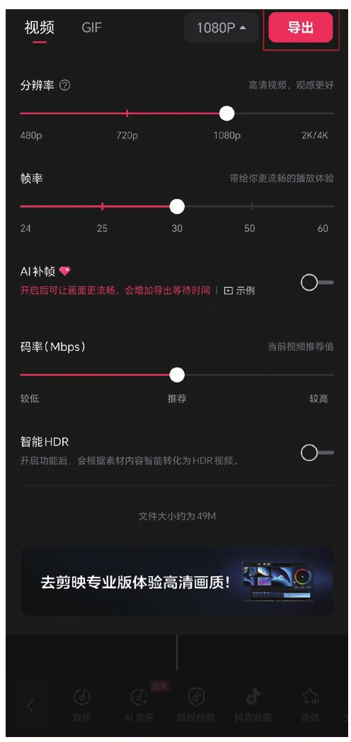 最后我们需要导出视频。点击创作界面右上角的“720P”(见图1.41),会出现参数设置界面,我们可以对导出参数进行设置。将“分辨率”设置为1080P,将“帧率”设置为30fps,其他设置保持默认值。设置完成后点击“导出”按钮(见图1.42),导出需要一些时间(见图1.43)。导出完成以后,点击“完成”按钮即可(见图1.44)。