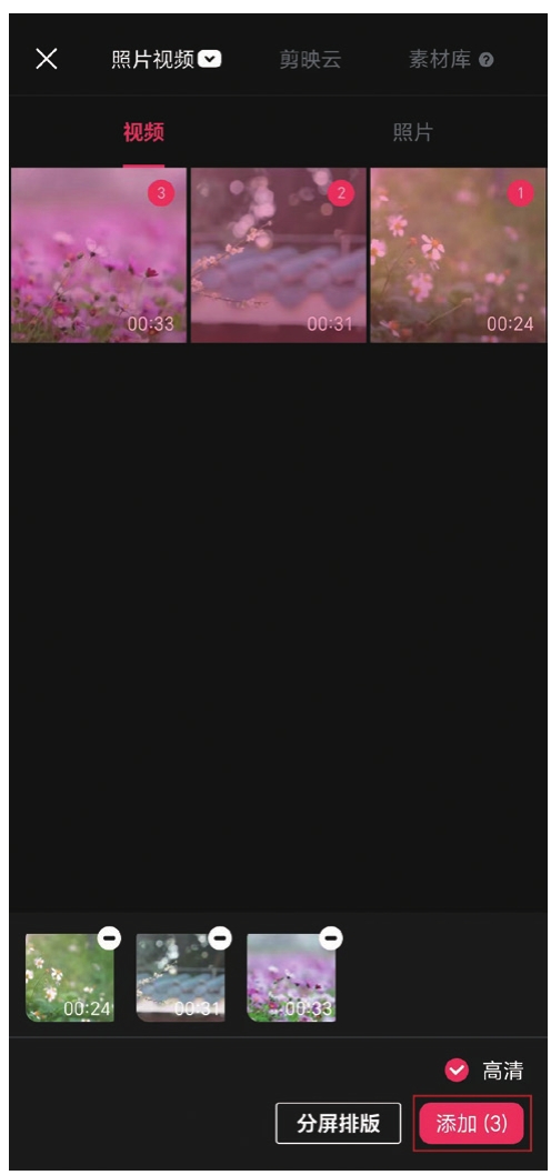打开剪映,点击“开始创作”按钮(见图1.27),在素材选择界面中找到相应的素材。如果要导入单个素材,选中素材后点击“添加”按钮即可。如果要导入多个素材,可以依次点击需要的素材再点击“添加”按钮。这里我们依次点击1、2、3号素材,然后点击“添加”按钮(见图1.28)。
