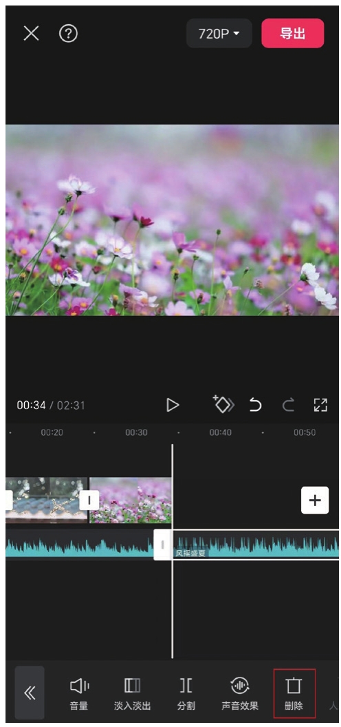 可以看到,音频比视频多出了一部分,所以我们需要对音频进行截取。使白色播放头位于视频的结尾,选中音频,点击“分割”按钮(见图1.37),视频结束后的这部分音频就会被分割出来。再选中被分割出的后半段音频,点击“删除”按钮(见图1.38)。此时,音频与视频的时长就对应了。