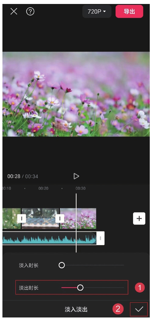 对音频进行分割、删除处理后,视频结尾会有些生硬。我们可以点击“淡入淡出”按钮(见图1.39),将音频的“淡出时长”调整至3秒(见图1.40),然后点击右下角的 按钮,在轨道中可以看到调整后音频的结尾显示圆弧状淡出标识。这样音频结束时就会有淡出效果,听起来更加柔和。