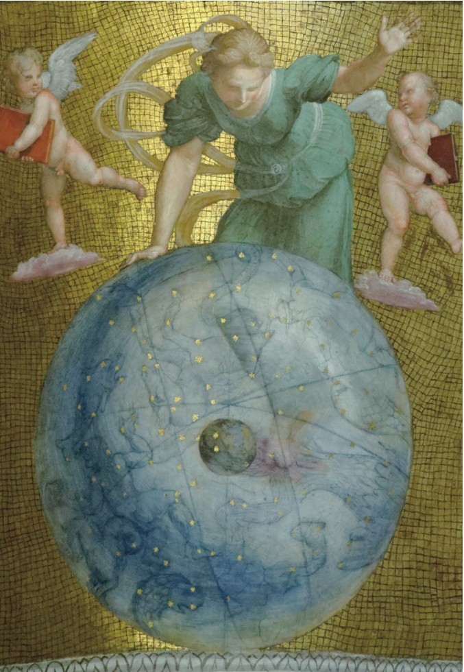 拉斐尔画作中的天球和司天女神乌拉诺斯。尽管夜空中的繁星离我们远近不一,但是我们可以将天空想象成一个球形巨幕,而这些星星就像镶嵌在这个球幕上一样。这一假想的球幕被称为天球,所有恒星在天球上都有一个相对固定的位置。