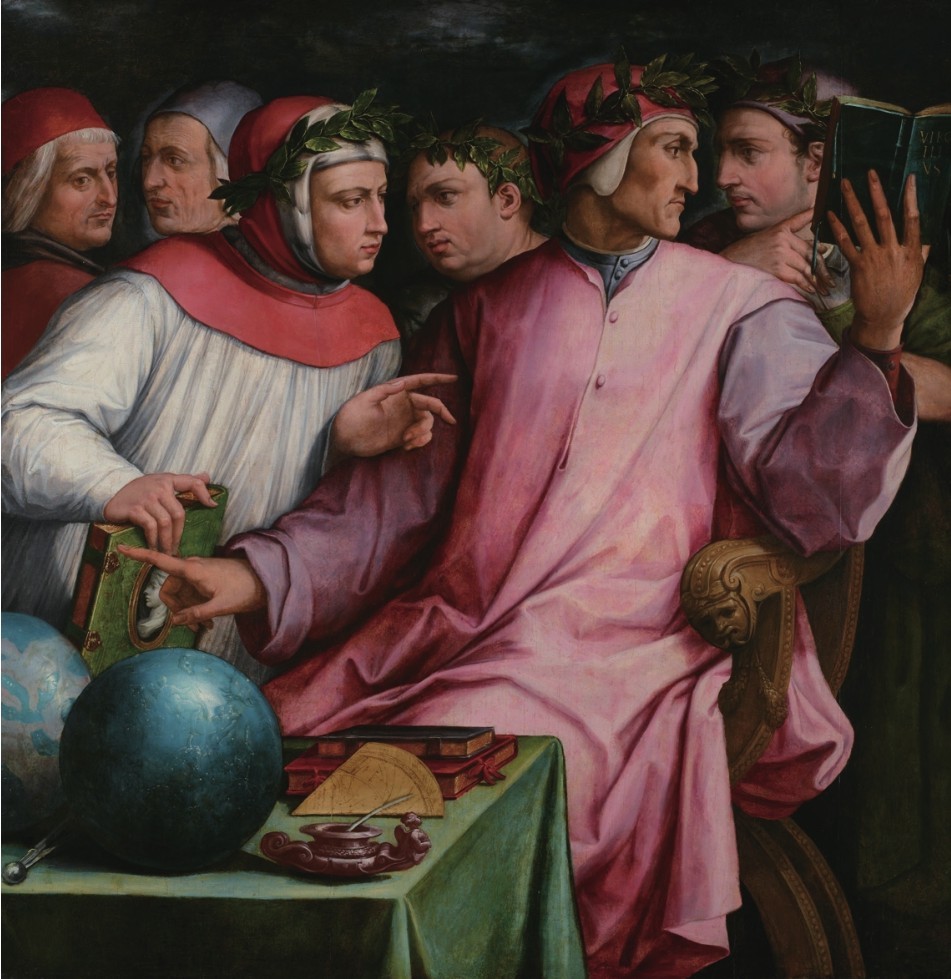 乔治·瓦萨里油画中的天球仪。这幅画的主题是6位托斯卡纳诗人之间的对话,诗人们面前的桌子上堆满了不同的物品,表现了他们对天文学、占星术、几何学、地理、语法和修辞学等不同知识的掌握。其中,星空也是文艺复兴时期的人们十分关注的话题。